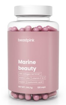 Marine Beauty je funkční komplex pro ženy. Základ tvoří špičkový rybí kolagen NATICOL®, který je zpracován maximálně šetrnými procesy, aby si zachoval co nejlepší vlastnosti. Další důležitou součástí Marine Beauty je kyselina hyaluronová. Ve složení ovšem nechybí ani důležité vitamíny a minerální látky. Základem je vitamín C, který přispívá ke správné tvorbě kolagenu pro optimální funkci kůže, chrupavek, zubů, kostí i dásní. Navíc i s vitamínem E funguje jako antioxidant, díky čemuž pomáhá chránit buňky před oxidačním stresem a volnými radikály. Vitamín C navíc přispívá ke správné funkci pokožky, stejně jako obsažený jód, zinek, biotin a měď. Zinek sám o sobě navíc podporuje i zdraví nehtů a vlasů. Měď pak přispívá ke zdravé pigmentaci vlasů a pokožky, což podtrhuje efekt celého komplexu. Marine Beauty je tak jedinečný doplněk pro každou ženu, která o sebe chce pečovat. Pokud by ve vaší beauty výbavě nemělo něco chybět, pak je to právě tento pomocník. Navíc má praktickou kapslovou formu, díky které se snadno užívá.