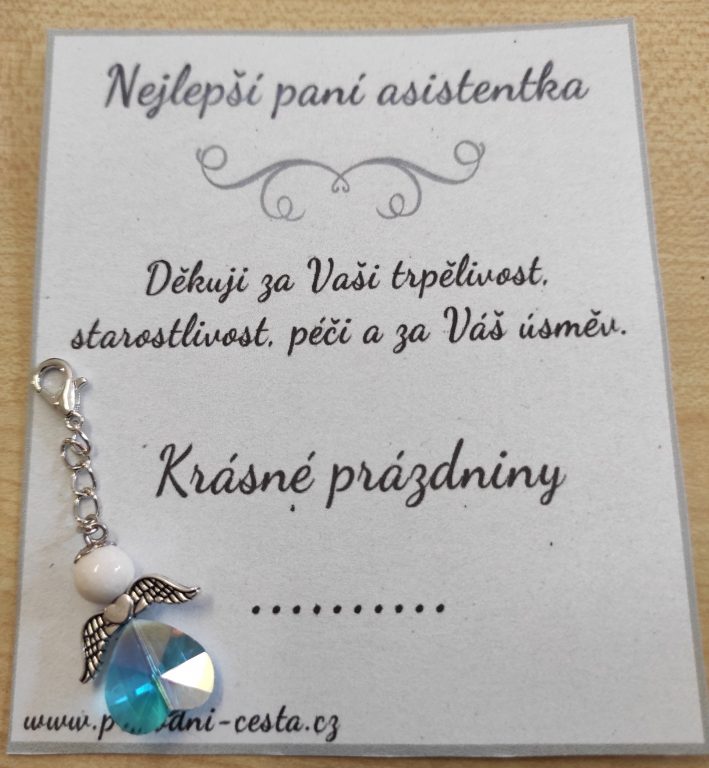 Korálek u hlavičky andílka se může lišit barvou. Zapínání může být jako kroužek-klíčenka, nebo stejné jako na obrázku.